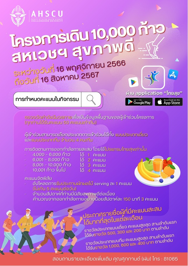 คณะสหเวชศาสตร์ จุฬาลงกรณ์มหาวิทยาลัย ร่วมกับไทยสุข สำนักงานพัฒนาวิทยาศาสตร์และเทคโนโลยีแห่งชาติ (สวทช.) จัดการแข่งขันสร้างเสริมสุขภาพใน โครงการ “เดิน 10,000 ก้าว สหเวชฯ สุขภาพดี” เพื่อส่งเสริมออกกำลังกาย และปรับเปลี่ยนพฤติกรรมให้มีสุขภาพที่ดีขึ้น