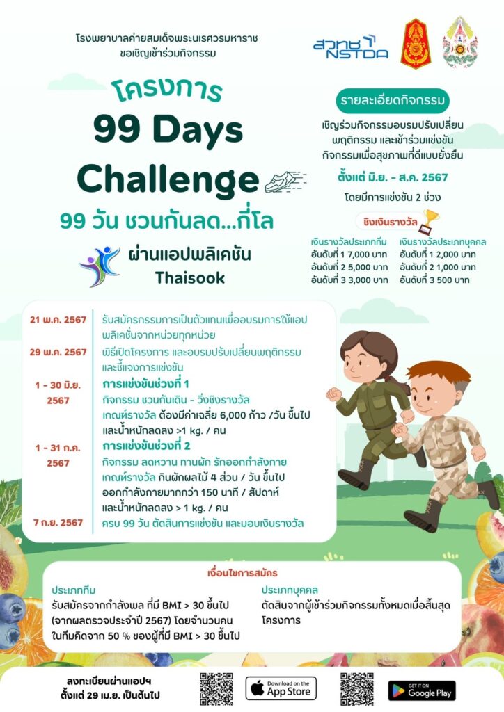 โรงพยาบาลค่ายสมเด็จพระนเรศวรมหาราช ร่วมกับไทยสุข สำนักงานพัฒนาวิทยาศาสตร์และเทคโนโลยีแห่งชาติ (สวทช.) จัดการแข่งขันสร้างเสริมสุขภาพใน โครงการ “99 Days Challenge” เพื่อส่งเสริมการปรับเปลี่ยนพฤติกรรมให้มีสุขภาพที่ดีของคนในองค์กร