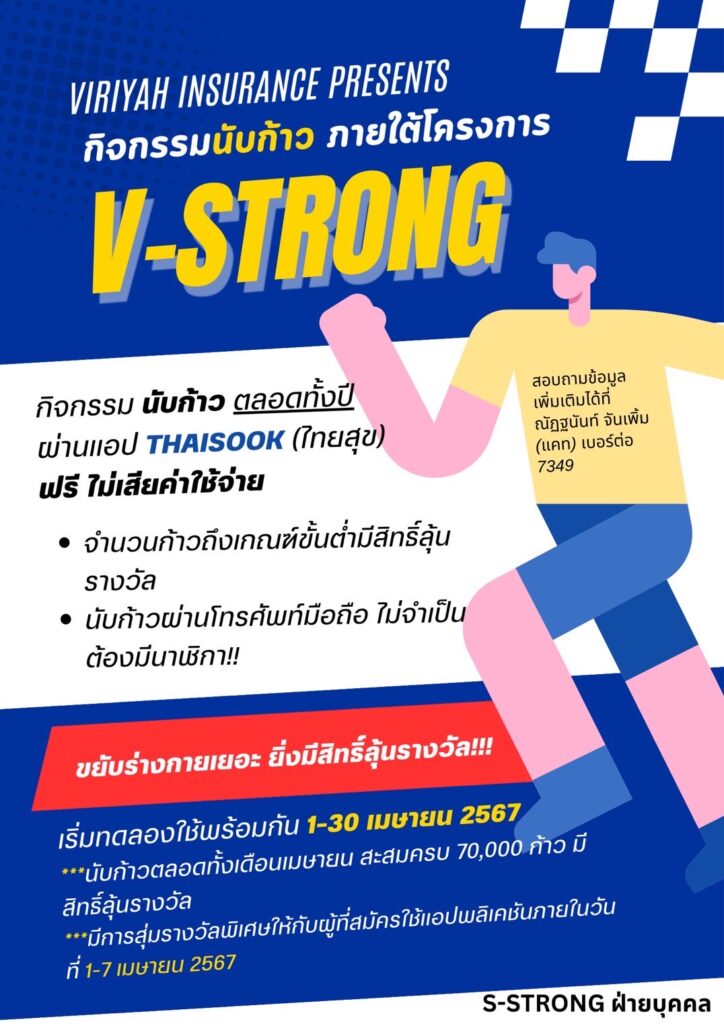 บริษัทวิริยะประกันภัย จำกัด (มหาชน) ร่วมกับไทยสุข สำนักงานพัฒนาวิทยาศาสตร์และเทคโนโลยีแห่งชาติ (สวทช.) จัดการแข่งขันสร้างเสริมสุขภาพใน โครงการ “กิจกรรมนับก้าว V-STRONG” เพื่อส่งเสริมการปรับเปลี่ยนพฤติกรรมให้มีสุขภาพที่ดีขึ้นของคนในองค์กร