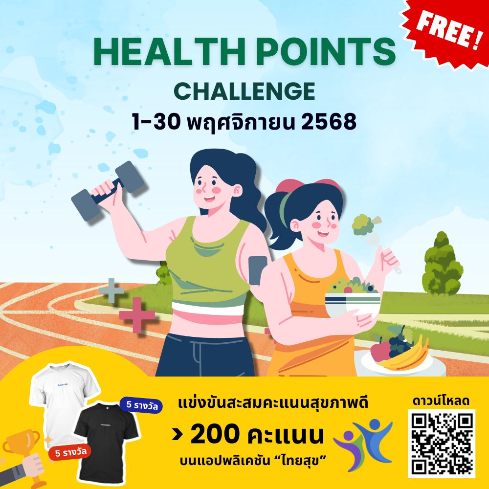 - เข้าร่วมการร่วมการแข่งขันในแอปพลิเคชันไทยสุข โดย กดที่ Challenge -> ทั่วไป -> แข่งสะสมคะแนนสุขภาพดี (Health Points Challenge)