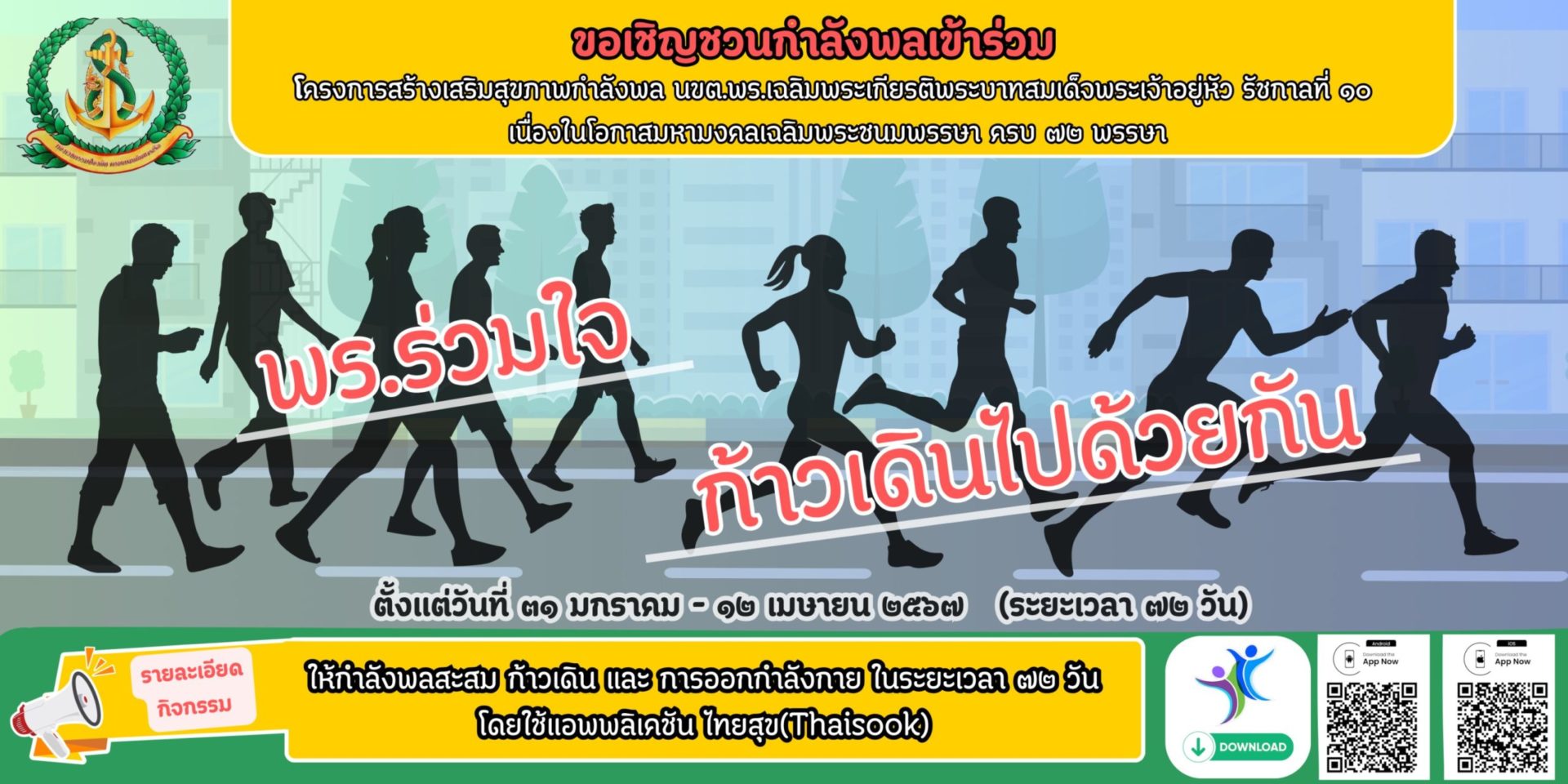 โครงการสร้างเสริมสุขภาพกำลังพล นขต.พร.เฉลิมพระเกียรติพระบาทสมเด็จพระเจ้าอยู่หัว รัชกาลที่ 10 เนื่องในโอกาสมหามงคลเฉลิมพระชนมพรรษา ครบ 72 พรรษา โดย กองเวชกรรมป้องกัน กรมแพทย์ทหารเรือ ร่วมกับไทยสุข สำนักงานพัฒนาวิทยาศาสตร์และเทคโนโลยีแห่งชาติ (สวทช.) จัดการแข่งขันสร้างเสริมสุขภาพใน โครงการ “พร.ร่วมใจ ก้าวเดินไปด้วยกัน” เพื่อเสริมสร้างสุขภาพกำลังพลกองทัพเรือ 📍 ระยะเวลาการแข่งขัน : 31 มกราคม – 12 เมษายน 2567 (72 วัน) 📍 รายละเอียด :  📍การใช้งานแอปพลิเคชันไทยสุข 🏅🎉อัปเดตการแข่งขัน กำหนดการประจำสัปดาห์ ประกาศผลรางวัล และสอบถามเพิ่มเติมได้ทาง Facebook: ThaiSook ไทยสุข ฝากกดติดตามกันด้วยนะคะ และขอให้ทุกท่านสนุก สุขภาพดีกับกิจกรรมของเราค่ะ 🎉🏅